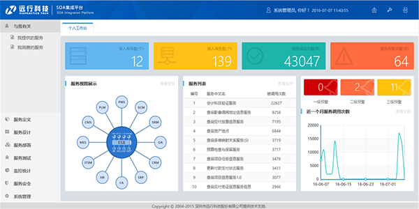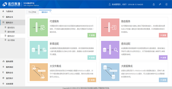 遠(yuǎn)行科技ESB服務(wù)總線是遠(yuǎn)行科技多年SOA咨詢規(guī)劃和項(xiàng)目實(shí)施的經(jīng)驗(yàn)積累,完全自主研發(fā),擁有自主知識(shí)產(chǎn)權(quán),該產(chǎn)品覆蓋完整的SOA生命周期和管控治理標(biāo)準(zhǔn),支撐業(yè)務(wù)服務(wù),數(shù)據(jù)服務(wù),大文件,流程服務(wù)等多方面的服務(wù)集成需求。